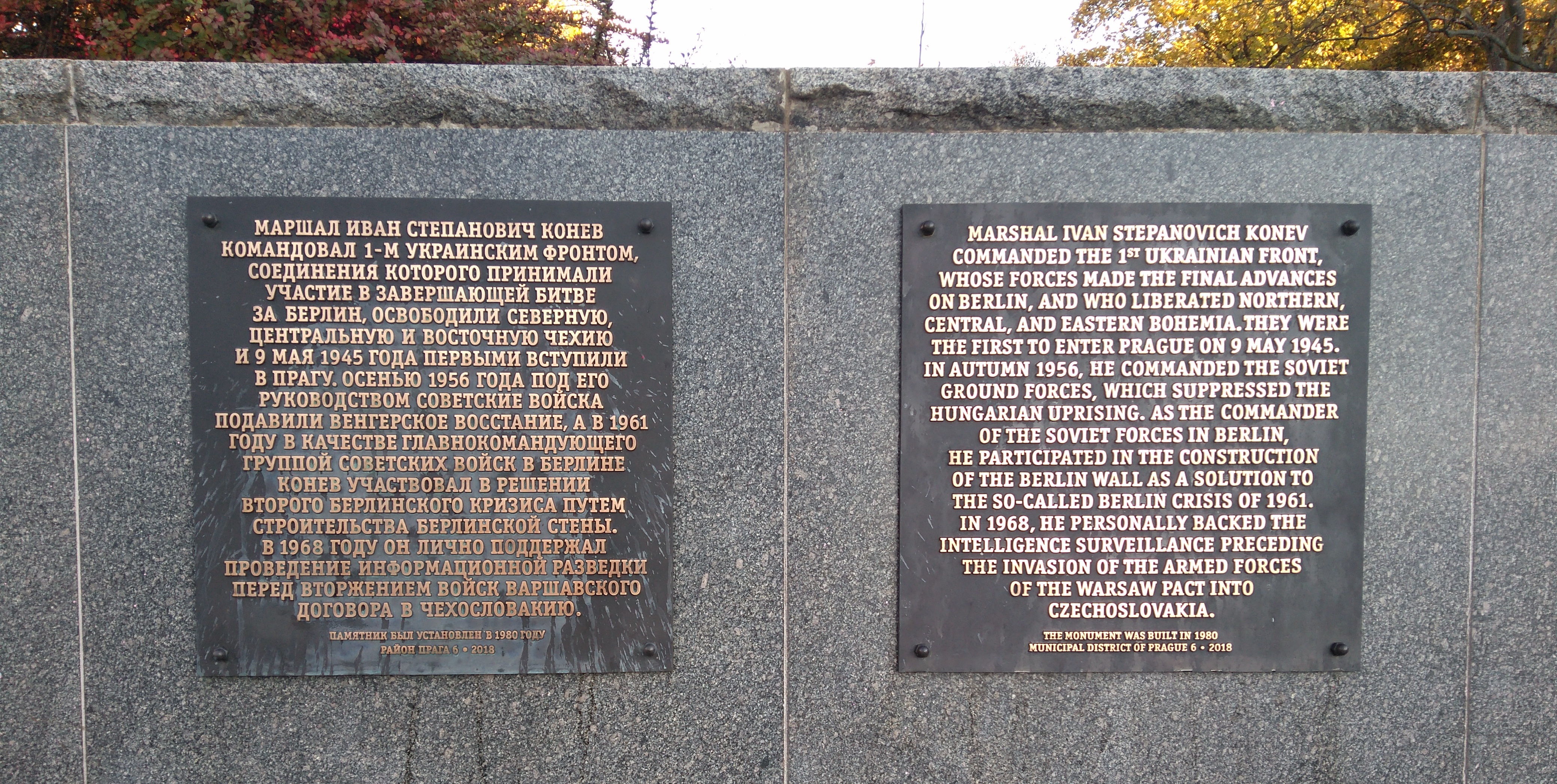 El barrio de Bubenec, en el Distrito de Praga 6, tiene su callejero repleto de homenajes al bando aliado en la Segunda Guerra Mundial. Hay una calle dedicada al presidente Roosevelt, otra a los partisanos yugoeslavos e incluso una plaza de las Brigadas Internacionales. En esta, desde 1980, permanece una estatua al mariscal Konev, quien al mando del Ejército Rojo fue el primer militar aliado en entrar en la Praga liberada de los nazis el 9 de mayo de 1945. Pero Konev también fue el estratega de la invasión soviética de Hungría en 1956 y el general que comandó los tanques rusos en la RDA durante la crisis de 1961 que llevó a la construcción del Muro. Desde 2018, una placa en el monumento recuerda estos últimos datos al visitante en checo, ruso e inglés.